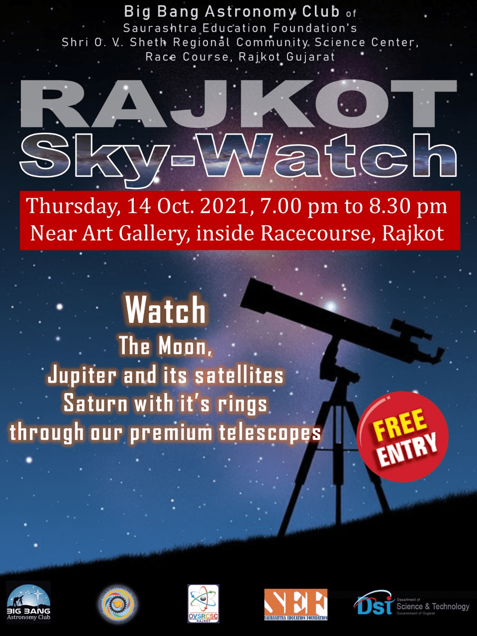 Rajkot Sky-Watch is one of our side-walk astronomy projects where we set up our premium telescopes in public places and show Moon and planets through them at no cost. On Thursday, October 14, 2021, we will show the following objects through our premium telescopes. MoonJupiter & it's satelitesSaturn with it's beautify rings.